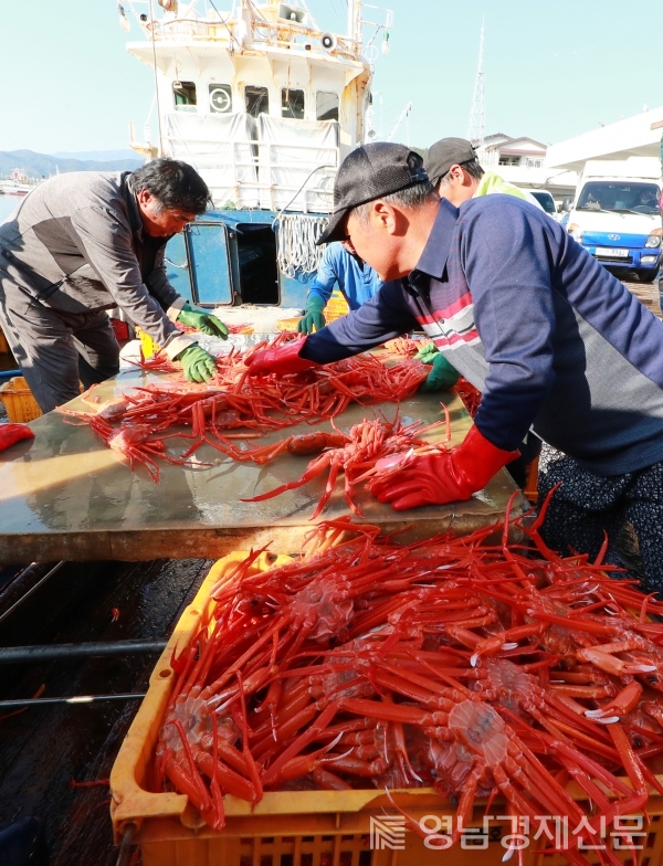 하지만 대중적인 가격에 비해 붉은대게를 잡는 일은 여간 수고스러운 게 아니다. 먼바다까지 나가야 하기에 한 번 나서면 길게는 8일까지 머문다는 붉은대게 조업. 요즘 평균 어획량은 2~3천마리 선이다.