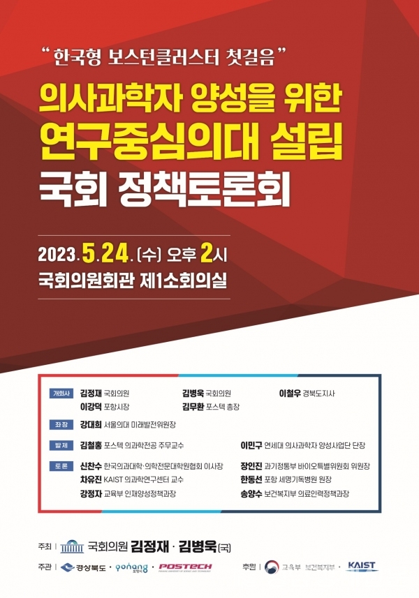 경북도와 포항시가 포스텍과 함께 오는 24일 국회의원회관 제1소회의실에서 ‘의사 과학자 양성을 위한 연구 중심 의대 설립 국회 정책토론회’를 개최한다.