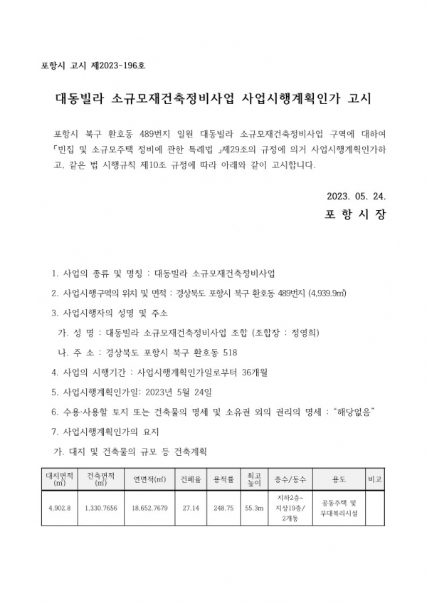포항 북구 환호동의 ‘대동빌라 소규모재건축정비사업’이 사업시행계획인가를 받아 사업이 본격 추진된다.