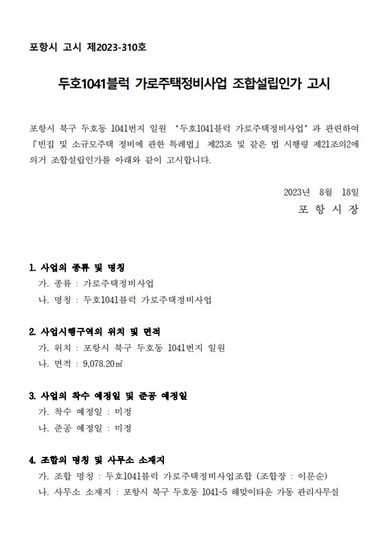 포항시는 두호1041블럭이 조합설립인가됨에 따라 7곳의 가로주택정비사업과 4곳의 소규모재건축 등 11곳에서 소규모주택정비사업이 조합설립인가를 받고 사업을 추진하고 있다.