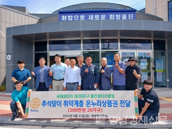 주돈혁 울진로타리클럽회장은“추석 명절 기간 동안 소외되기 쉬운 저소득 주민들이 따뜻한 명절을 보내길 바라는 마음으로 상품권을 전달했다”라며“앞으로도 울진군 내 소외된 이웃들을 위해 지원을 아끼지 않겠다”라고 말했다.