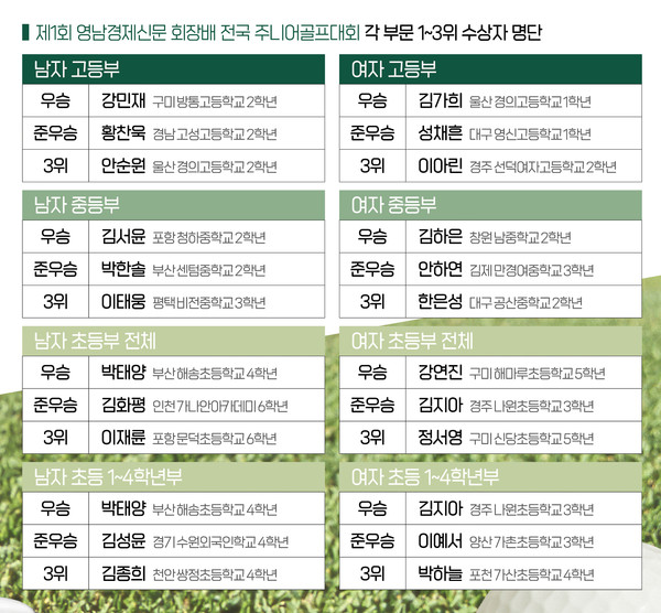 영남경제신문사와 ㈔한국주니어골프협회가 주최·주관하고 경북도와 경주시가 후원한 이번 대회는 장차 세계 무대에서 활약할 주니어 골프 선수들을 위한 축제의 장이자 선의의 경쟁무대를 마련함은 물론, 미래의 글로벌 골프 유망주를 발굴하기 위해 마련됐다.