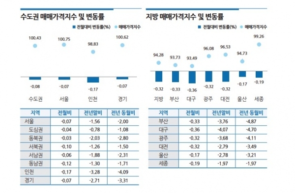 전국 매매시장은 고금리의 지속, 특례보금자리론 축소 등 경색된 주택시장 영향과 오피스텔 투자수요 둔화로 하락폭이 확대(-0.10%→-0.13%)됐다.