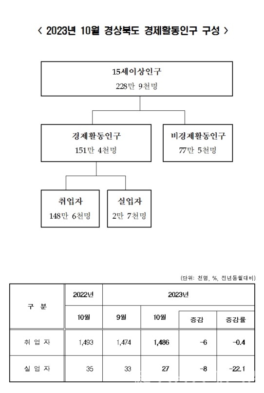 경북도의 15세이상인구는 전년동월대비 3만8천명(1.6%) 감소한 228만9천명으로 집계됐다.