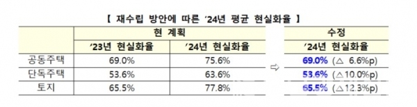 내년도 현실화율은 당초 공동주택은 75.6%→69.0%, 단독주택 63.6%→53.6%, 토지 77.8%→65.5%로 수정된다.