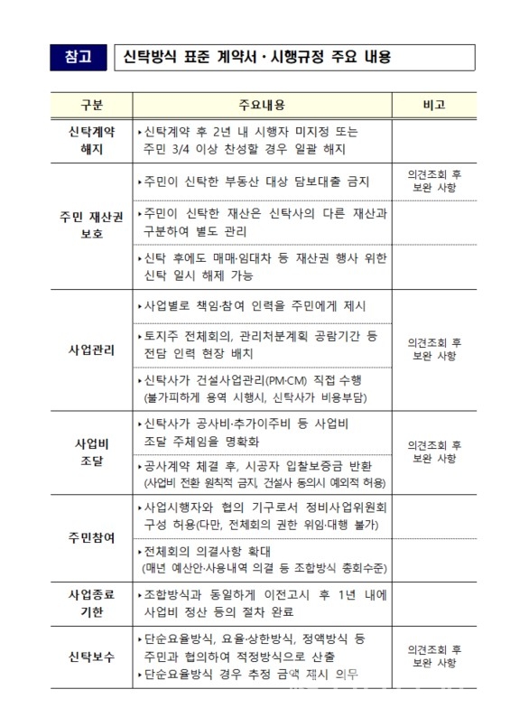 표준안은 토지소유자 재산권 보호, 신탁사의 사업관리·자금조달 및 신탁보수 산정방법 등이 추가됐다.