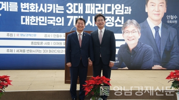 안철수 의원은 6일 포항산림조합강당에서 영남경제신문 주최로 열린 정책포럼에서 ‘세계를 변화시키는 3대 패러다임과 대한민국의 7대 시대정신’이란 주제의 강연을 끝낸 뒤 사회를 맡은 이재원 포스텍 겸직교수의 질문에 이같이 답변했다.