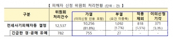 또 17회의 걸친 전체회의에서 전세사기피해자 등으로 가결된 것은 1만256건이며 긴급 경·공매 유예 협조요청 가결은 755건으로 집계됐다.