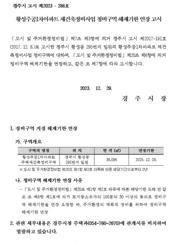 경주시에 따르면 조합은 2017년 12월 정비구역지정을 받고 지난 2020년 10월경 조합설립 인가를 받았지만 조합설립인가 후 3년 이내 사업시행계획인가 신청을 하지 못해 정비구역지정 해제 위기에 놓였었다.