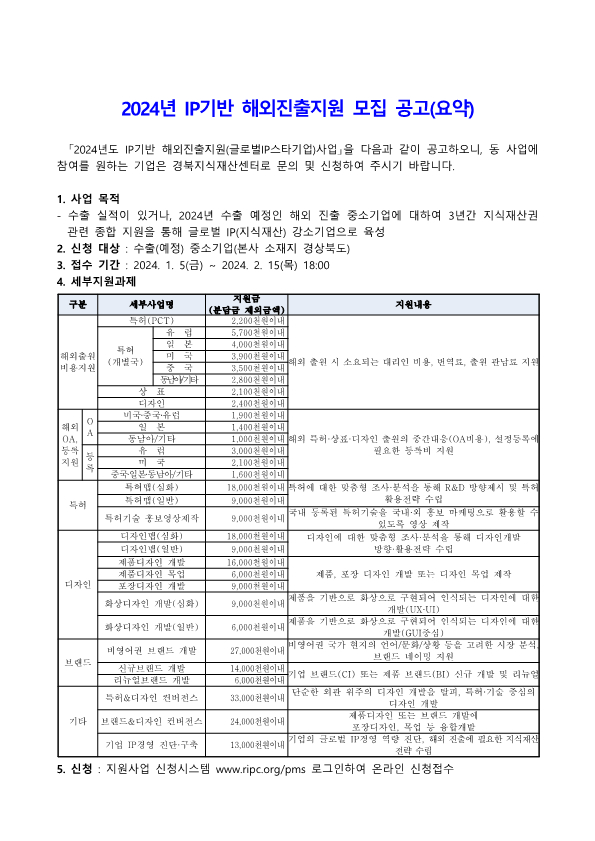 지원내용으로는 해외권리화(출원·OA·등록)비용지원, 특허맵, 특허기술 홍보영상, 디자인개발(제품·포장·화상), 브랜드개발(신규·리뉴얼) 등이며 기업당 연간 최대 7천만원, 3년간 최대 2억1천만원까지 예산 범위내에서 지원한다.
