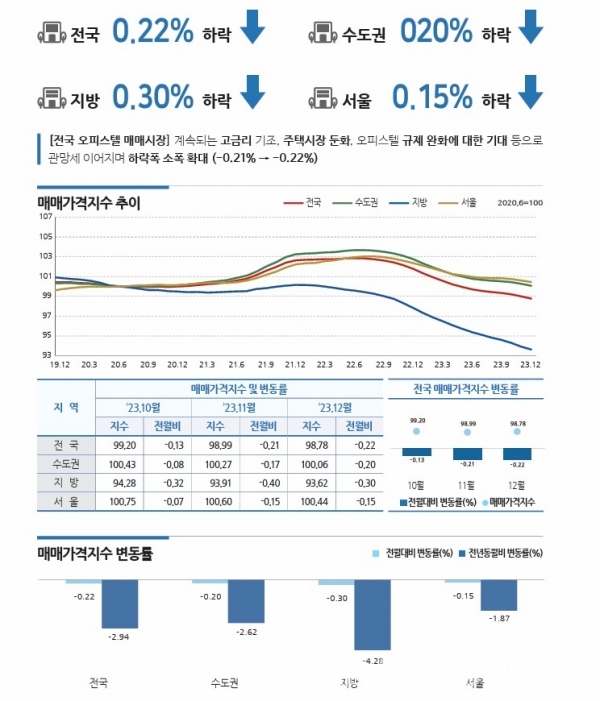 고금리 기조의 장기화, 주택시장 둔화, 오피스텔 규제 완화에 대한 기대감 등으로 관망세가 이어졌다고 분석하며 하락폭이 전월보다 소폭 확대했다고 밝혔다.