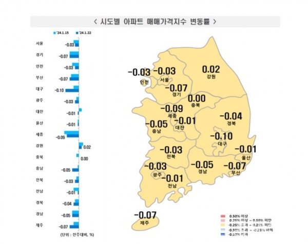 대구시의 1월 3주차 변동률은 -0.10%로 전국에서 가장 높은 하락률을 보였다.