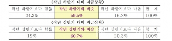 작년 하반기 대비해서는 비슷하다는 의견은 59.5%, 힘들다는 의견은 24.3%, 나아졌다는 의견은 16.2% 순으로 나타났다.