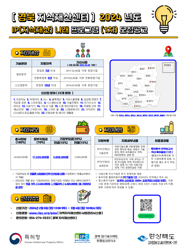 이 IP나래 프로그램 사업은 본사 기준 포항시, 경주시, 영천시, 경산시, 영덕군, 청도군, 울진군, 울릉군 등 도내 8개 시·군에 소재한 중소기업을 대상으로 지원한다.