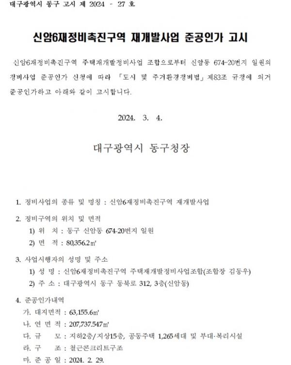 4일 대구시 동구청에 따르면 신암6재정비촉진구역 재개발사업의 준공일은 지난 2월 29일이며 4일 고시했다.