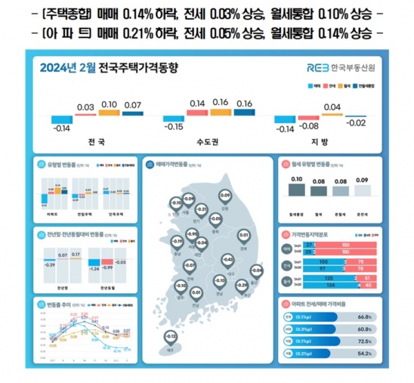 한편, 전국 주택종합 매매가격지수는 -0.14%를 기록해 전월과 같은 수준으로 나타났고 아파트 -0.21%, 연립주택 -0.09%, 단독주택 +0.07%를 기록했다.