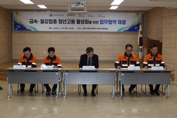 포스코가 19일 포스코 정비자회사 3사(포스코 PS테크, 포스코PR테크, 포스코PH 솔루션)와 고용노동부 포항지청과 함께 "금속·철강업종 청년고용 활성화를 위한 업무협약"을 체결했다.
