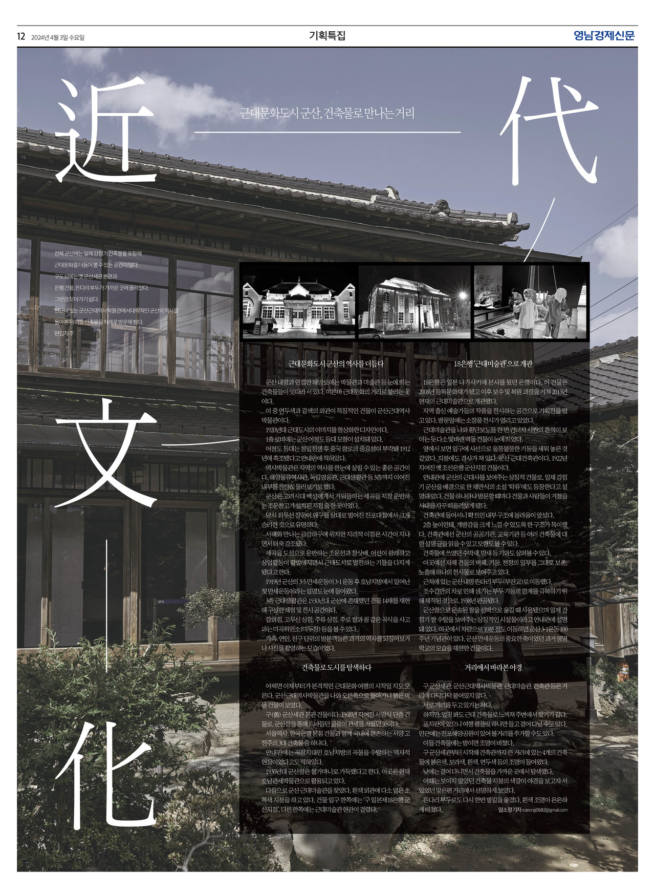 제작/임소정 기자 임소정 기자 sojeong0682@gmail.com 다른기사 보기 저작권자 © 영남경제 무단전재 및 재배포 금지 당신만 안 본 뉴스 경북도, 5천억원 투입하는 경주 보문단지 大 리노베이션 추진 동해선 철도 관광객 폭증… 연말 350만명 돌파 전망 [심층기획]옛 포항역 70층 시행사 완전자본잠식… 신세계건설로 번지는 재무 리스크 포항 이차전지·수소·철강 중심 산업지형 재편 나선다 포항 민간공원 아파트 30% 법적 한도 햇볕 받지 못한다 동해선 KTX-이음 내달 투입한다… 포항, 이용객 1위 ‘허브 도시’ 부상 효성 해링턴 영주 더리버 대지분양가 ‘뻥튀기 산정’ 논란 경북도, 5천억원 투입하는 경주 보문단지 大 리노베이션 추진 댓글삭제 삭제한 댓글은 다시 복구할 수 없습니다. 그래도 삭제하시겠습니까? 비밀번호 닫기 기사 댓글 4 댓글 접기 로그인 후 이용 가능합니다. 댓글 내용입력 비회원 로그인 이름 비밀번호 댓글 내용입력 댓글쓰기 계정을 선택하시면 로그인·계정인증을 통해 댓글을 남기실 수 있습니다. 회원 로그인 비회원 글쓰기 이름 비밀번호 자동등록방지 로그인 옵션 창닫기 댓글목록 최신순 추천순 욕설, 타인비방 등의 게시물은 예고 없이 삭제 될 수 있습니다. 기여부넹 2024-04-08 14:17:00 더보기 삭제하기 오...멋진곳이네요. 기사를 보니 부모님과 함께 방문해보고 싶어지네요^^ 감솨~ 마이구미 2024-04-08 13:58:34 더보기 삭제하기 군산이 근대문화를 간직하고 있는 곳이었군요... 이 지면을 보니 군산이 한층 궁금해졌습니다.. 임소정 기자님, 좋은 곳을 알려주어 고맙습니다.. 김경자 2024-04-08 13:52:19 더보기 삭제하기 군산에 이런 곳이 있는 줄 몰랐네요..... 기사와 편집 디자인의 조화가 아주 굿 입니다^^ 농협은행 2024-04-08 13:45:43 더보기 삭제하기 너무 예쁘네요. 주요기사 [영상뉴스]오늘의 주요뉴스 2025년 11월 26일 2025년 11월 26일 기획특집 [인포그래픽] 포항 철강산단 OCI 스팀 관로 방치 논란 포항 철강산단 공급 스팀 관로 파손한 채 방치... 경북도 “나 몰라라” 포항 기업혁신파크 발암물질 등 환경문제 공청회에서 해법 찾는다 [사설]의성군, 특정업체 태양광발전 사업성 위해 군유지 제공하나