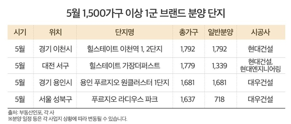 전국 주요 지역에서 1군 건설사 브랜드 아파트가 공급되고, 1천500가구 이상 대규모 단지도 다수 포함됐다.