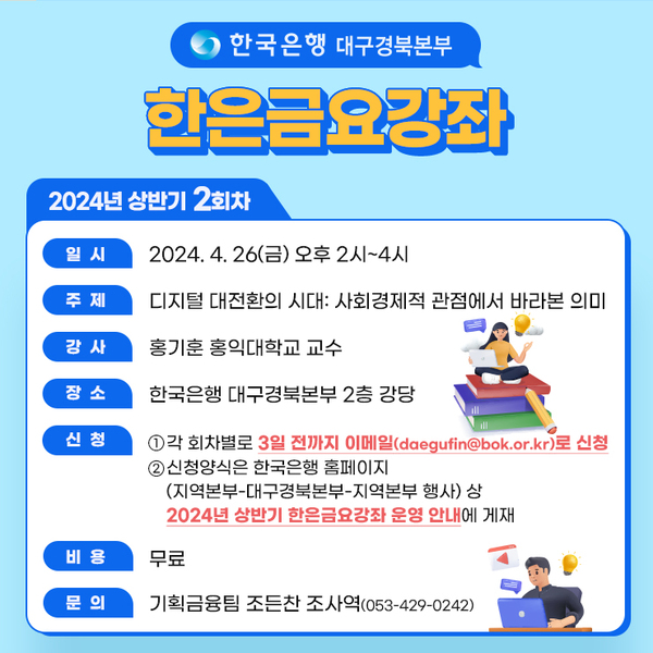 상반기인 3~5월중 총 3회에 걸쳐서 한국은행 대구경북본부(2층대강당)에서 진행된다.