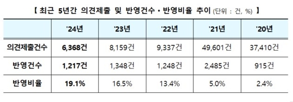 이결과 전년대비 22% 감소한 6천368건의 의견이 제출됐는데 최근 5년 중 가장 적은 수준으로 나타났다.