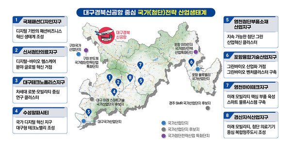 △경북지역은 친환경차, 이차전지, 바이오 등 분야를 중심으로 배터리리사이클규제자유특구, 강소연구개발특구 등을 지정해 입주기업들이 대학, 연구기관들과 협력해 글로벌 시장에서 경쟁력을 강화할 수 있도록 지원하고 있다. 대구지역은 전기차 모터, 서비스 로봇 및 ABB산업 육성과 미래 모빌리티 시대의 전환에 대비한 인력 양성과 자율주행 실증기반 구축, UAM(도심항공교통) 선도도시 조성 등의 구상을 현실화하기 위한 노력을 전개하고 있다.