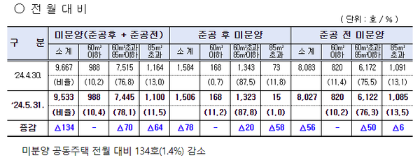 전체 미분양 주택 수는 9천533호로 전월(9천667호)보다 134호 줄었다. 전체 미분양주택은 지난해 2월 이후 지속적인 감소 흐름을 보이며 올해 2월 1만호 밑으로 떨어졌다.