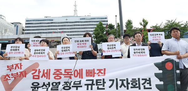 민주당 기획재정위원회 소속 의원들은 성명을 통해 "상위구간 과표를 조정하고 세율을 40%로 낮추는 게 대체 서민·중산층과 무슨 관계인가"라고 지적했다.