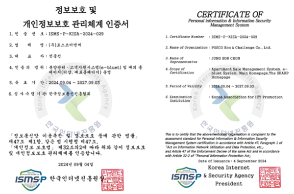 포스코이앤씨는 현재 정보보호 국제표준인 ISO27001(정보보안경영시스템) 인증을 보유하고 있다. 이에 더해 ISMS-P 인증을 추가로 획득하게 되면서 국내 최고 수준의 정보보호 및 개인정보보호 체계를 갖출 수 있게 되었다.