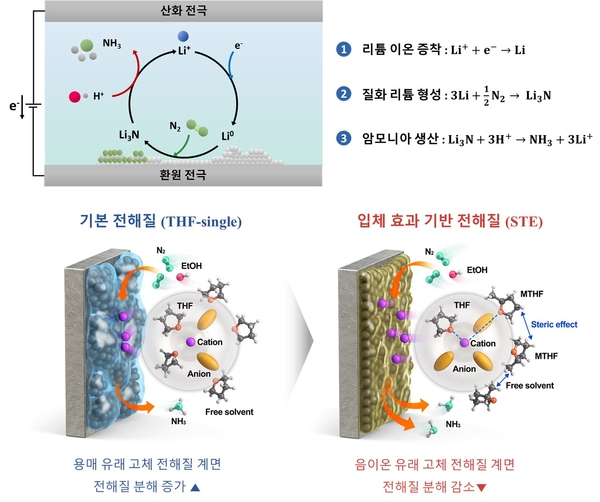 POSTECH 화학공학과 용기중 교수 연구팀은, POSTECH 화학공학과 전상민 교수팀과의 공동 연구를 통해 용매의 입체 효과를 도입한 전해질 엔지니어링으로 친환경 암모니아 생산 효율을 높였다.