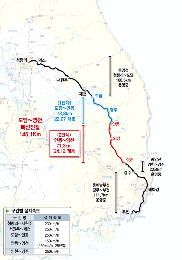 1942년 개통된 중앙선은 그동안 단선 비전철 구간으로 남아있었다. 정부는 1990년대부터 중앙선의 속도 향상과 수송 용량 확대를 위해 복선 전철화 사업을 단계적으로 추진해왔다. 올해 마지막 구간인 '도담-영천' 복선 전철화 사업이 완료되면서, 청량리부터 경주까지 328km 전 구간이 복선전철로 연결됐다.
