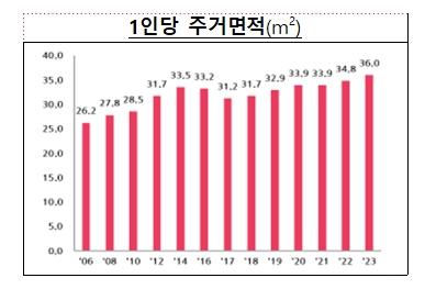주거 수준 지표인 1인당 주거면적은 36.0㎡로 전년 34.8㎡ 대비 1.2㎡ 증가했다.