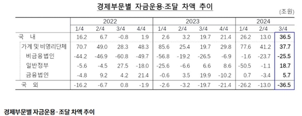 한편, 기업 부문에서는 순자금 조달 규모가 증가했다. 비금융 법인기업의 3분기 순자금 조달 규모는 25조5천억원으로, 3개월 새 1조8천억원 늘었다. 한국은행은 기업 순이익은 축소됐지만 고정자산 투자가 늘어난 것이 원인이라고 분석했다.