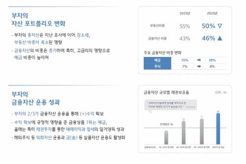부자들의 자산 포트폴리오를 살펴보면, 총자산 중 부동산 자산이 55.4%, 금융 자산이 38.9%를 차지했다. 그러나 최근 몇 년간 부동산 자산의 비중이 점차 감소하는 추세를 보이고 있다. 하나금융연구소의 '2024 대한민국 웰스 리포트'에 따르면, 부동산 자산의 비중은 2021년 58%에서 2023년 50%로 감소했다.