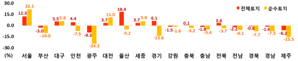 울산이 토지거래량으로 탑...수도권 지가 상승세 두드러져, 순수토지 거래량은 감소세