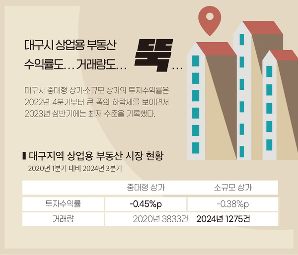 한국은행 대구경북본부에 따르면 대구지역 중대형 상가 및 소규모 상가는 모두 2022년 3분기까지는 전국 대비 투자수익률이 높았으나 2022년 4분기부터 큰 폭의 하락세를 보이면서 2023년 상반기에는 최저 수준을 기록했다.