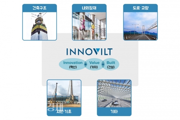 이노빌트(INNOVILT)는 혁신의 Innovation, 가치의 Value, 건설의 Built를 결합한 합성어로, 친환경성과 독창성을 담은 미래기술 혁신을 통해 강건재의 가치를 높이겠다는 의미가 담겨있다.