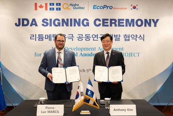 이날 협약식에는 김윤태 에코프로이노베이션 대표, 피에르 뤽 막실 하이드로퀘백 연구총책임자, 다미엥 페레라 퀘백정부 대표, 존 짐머만 캐나다대사관 대표 등 양사 주요 경영진 및 캐나다 주정부 관계자들이 참석했다.