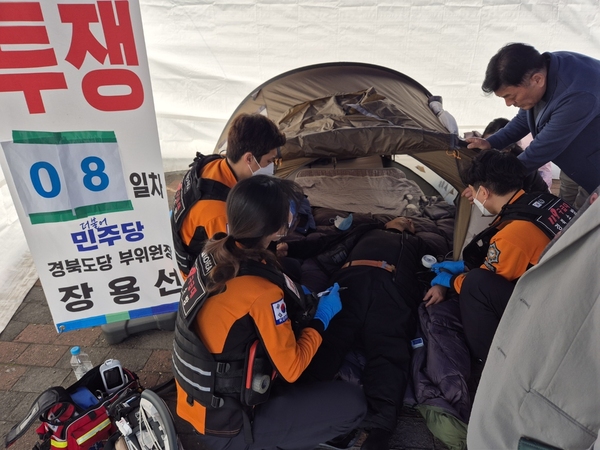 장용선 더불어민주당 경상북도 부위원장이 윤석열 대통령 파면을 촉구하며 진행해온 단식이 8일 만에 건강 악화로 중단됐다. 지난 24일 체력 한계와 어지럼증, 구토 증상으로 병원에 긴급 이송됐다.