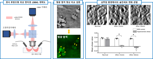 연구팀이 개발한 OBM 기술은 조명광을 현미경 주변에 위치시켜 빛이 세포를 비스듬히 통과하게 하는 방식이다. 세포가 빛을 굴절시켜 영상을 생성하는 원리를 활용해, 형광 염색 과정 없이도 일반 광학 현미경으로 술잔세포를 직접 관찰할 수 있게 했다.