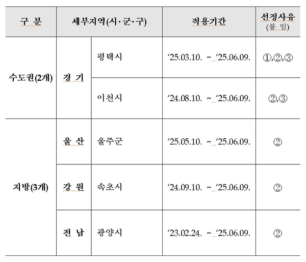선정된 지역의 적용 기간은 지역별로 상이하다. 평택시는 2025년 3월 10일부터 6월 9일까지, 이천시는 2024년 8월 10일부터 2025년 6월 9일까지 적용된다.
