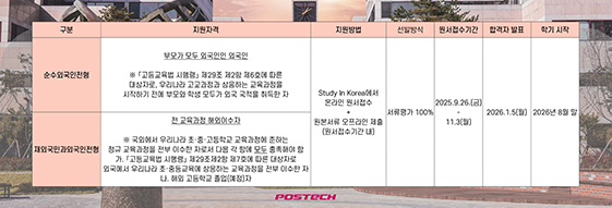 2026학년도 외국인 학부 입시에 관한 세부 정보는 POSTECH 외국인 입학 홈페이지(adm-iu.postech.ac.kr)에서 확인 가능하다. 원서 접수는 9월 26일부터 11월 3일까지 Study in Korea 웹사이트(www.studyinkorea.go.kr)를 통해 진행된다.