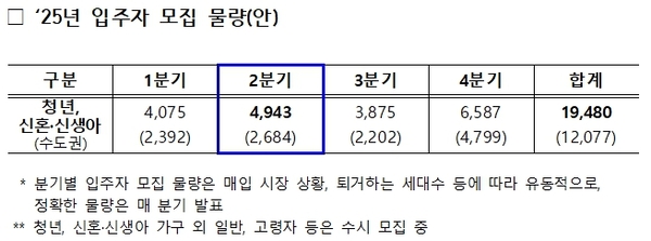 한편, 국토교통부는 2025년 총 19,480호(수도권 12,077호)의 청년·신혼·신생아 매입임대주택을 공급할 계획이며, 분기별 입주자 모집 물량은 매입 시장 상황, 퇴거하는 세대수 등에 따라 유동적으로 조정될 예정이다.
