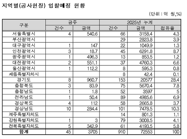 조달청에 따르면, 이번 주 집행 예정인 45건 중 41건은 지역제한 입찰 또는 지역의무 공동도급 대상공사로, 약 1,177억 원(32%)을 지역업체가 수주할 것으로 예상된다.