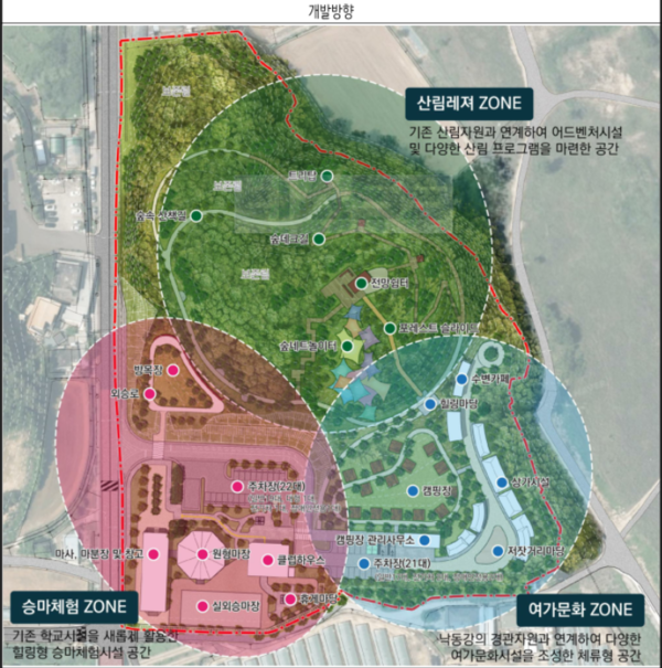 조성 계획에 따르면 테마파크는 △승마체험존 △여가문화존 △산림레저존 등 3개 주요 구역으로 구성된다.