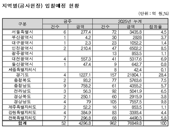 조달청의 이번 주 입찰은 2025년 누적 공사 입찰액 7조 6,850억 원 중 일부로, 연간 누적 기준으로는 건축공사(47.7%)와 토목공사(39.3%)가 전체의 87%를 차지하고 있다.