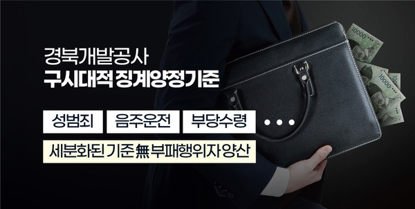 경북개발공사가 철 지난 징계규정을 손보지 않고 방치하며 성폭력과 음주운전, 부당수령 등에 대한 세분화된 기준을 적용하지 않아 부패행위자를 양산하고 있다는 지적이다.