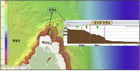 흥미로운 사실은 구룡반도 동해안에 넓게 발달한 4단의 해안단구처럼 수중 파식대도 3계의 단(段)으로 발달해 있다는 점이다. 해안에서 500m 지점까지 1단에 해당하는 파식대의 수심은 5~6m이며, 2단은 1단보다 급경사를 이루고 수심은 6~20m에 달한다.