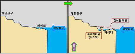 아래 그림은 지각의 융기와 파랑의 침식으로 해안단구와 파식대가 형성되고, 그 과정에서 침식을 견디고 남은 암석의 단단한 부분이 독수리 바위가 되는 과정을 보여준다. 독수리 바위가 있는 현재의 파식대도 수만 년 후 융기하면, 오늘날 사람이 거주하고 있는 구만리 해안단구와 같은 지형이 될 것이다.
