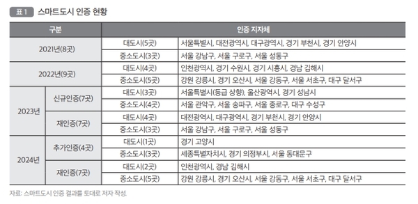하지만 제도 운영 과정에서 여러 문제점이 드러났다. 지자체 설문조사 결과 응답자의 55% 이상이 인증제가 스마트도시 정책·사업 관리에 필요하다고 답했지만, 60%는 인증 준비 과정이 어렵다고 응답했다. 특히 벤처기업 수, 팹랩 운영 건수, 민간투자유치 규모 등 일부 지표는 중요도는 낮지만 자료 작성 난이도가 높은 것으로 나타났다.